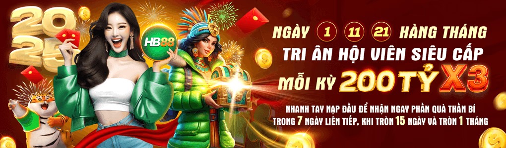 - Ngày hội siêu cấp VIP: Diễn ra vào các ngày 1, 11 và 21 hằng tháng, chương trình tri ân này mang đến hàng loạt phần thưởng tiền mặt, vòng quay may mắn và lì xì siêu giá trị. Đặc biệt, hội viên VIP của HB88 sẽ được hưởng chính sách “Đặt cược – Đầu tư – Nhận lương”, cùng tiền định kỳ mỗi tuần, mỗi tháng với tổng giá trị lên đến hàng trăm tỷ/năm.